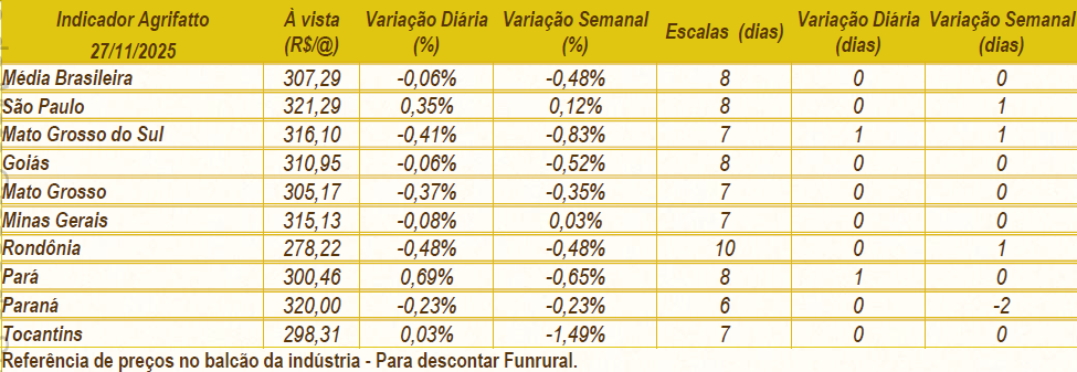 Na CBOTem razão do feriado nos Estados Unidos não houve negociações para os futuros da soja. Desta forma, no fechamento da última sessão, em 26/11, o contrato de janeiro/26 (ZSF26) encerrou com alta de 0,60%, finalizando o dia negociado a US$ 11,31 por bushel. No último pregão, o farelo de soja tendeu à estabilidade, sem um direcionamento certo no dia. O contrato mais curto, com vencimento para dez/25 (ZMZ25), registrou alta de 0,03% e finalizou o dia precificado a US$ 317,10 por tonelada.