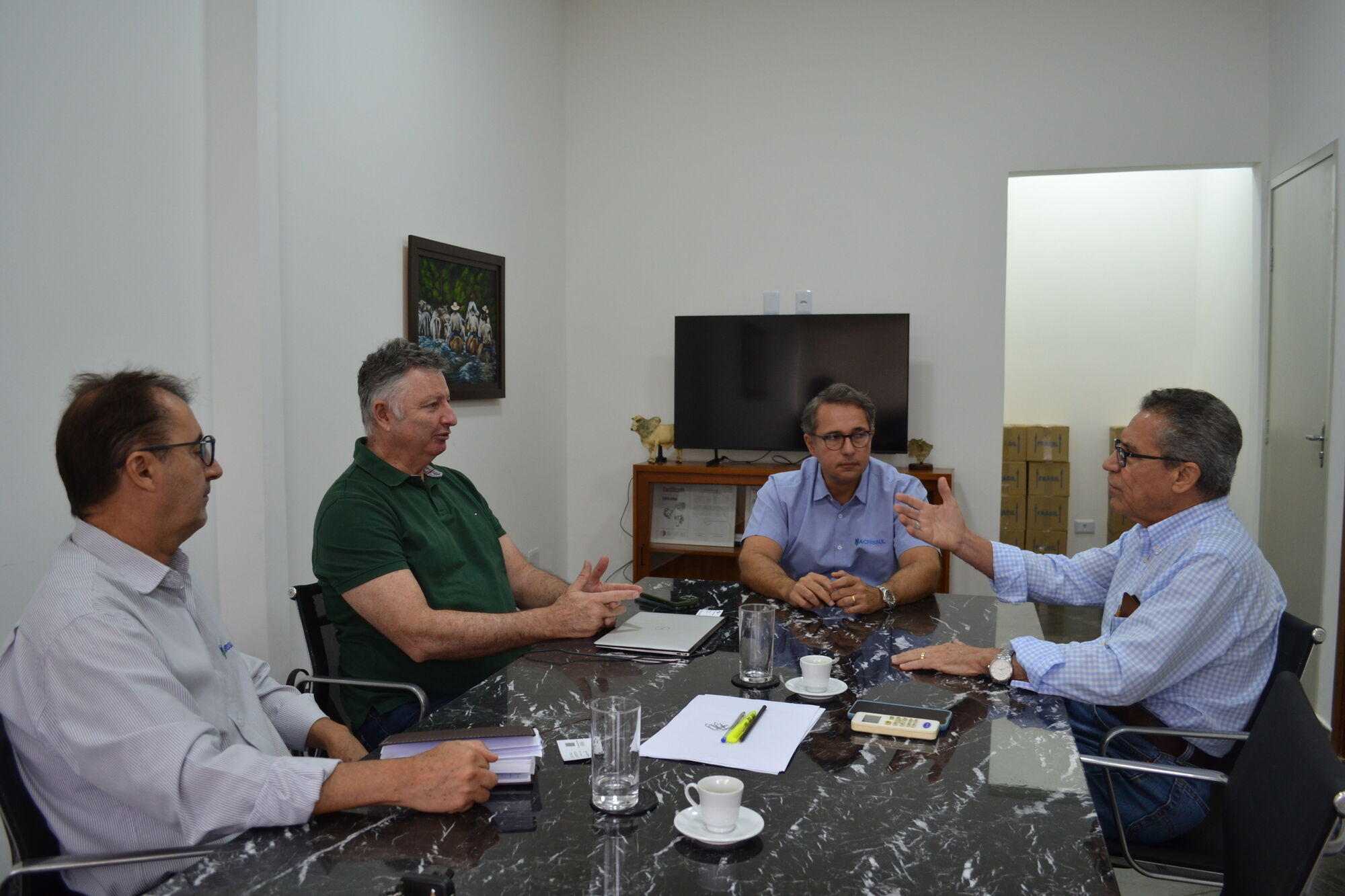 Durante a parte da tarde, Flávio Malmann fez uma apresentação para um grupo de pecuaristas na sede da Acrissul e, logo depois, realizou uma demonstração a campo para os produtores rurais em um pavilhão do Parque de Exposições Laucídio Coelho, com animais de elite da Agropecuária Ribalta, que participarão da Expogenética MS 2025.
