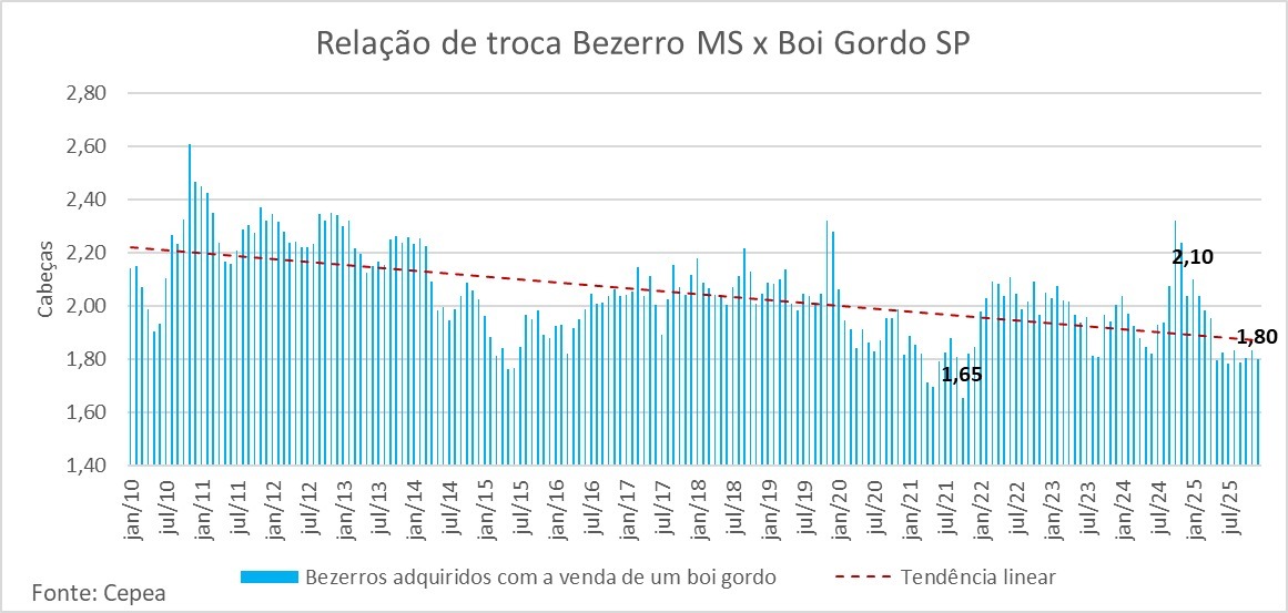 Para efeito de comparação, o menor patamar da série histórica foi atingido em outubro de 2021, com 1,65 bezerro. Essa queda acentuada reflete a valorização do animal de reposição acima da do boi gordo, característica típica de momentos de retenção e virada de ciclo.