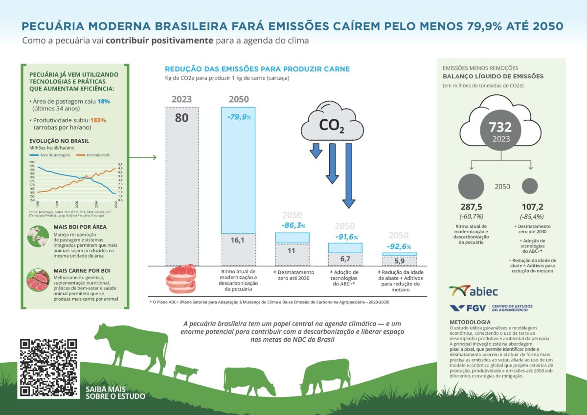 A pecuária de corte brasileira, que já é a maior exportadora mundial de carne bovina, caminha para consolidar ainda mais seu papel de protagonismo na transição climática global. Um estudo da Fundação Getúlio Vargas (FGV), em parceria com a Associação Brasileira das Indústrias Exportadoras de Carnes (ABIEC), comprova que o setor vai reduzir em pelo menos 79,9% as emissões de CO2 equivalente para produzir um quilo de carne até 2050, se mantiver o ritmo atual de adoção de práticas mais eficientes de produção e de conversão de novas áreas para pastagem. Com o cumprimento da meta do governo brasileiro de zerar o desmatamento até 2030 e se for acelerada a implantação de medidas adicionais, como recuperação de pastagens e adoção de práticas de pecuária regenerativa, essa redução pode chegar a 92,6%.