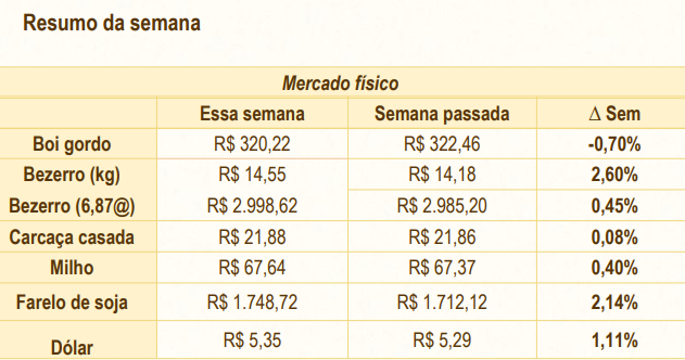 O bezerro ficou cotado na média da semana em R$ 2.998,62/cab, valorização de 0,45% em comparação com a semana anterior. Diante deste cenário, o preço por quilograma registrou incremento de 2,46%, sendo cotado a R$ 14,55/kg no comparativo semanal.
