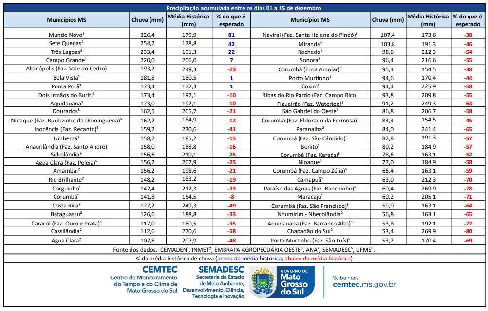 Previsão elaborada por técnicos do Cemtec/MS (Centro de Monitoramento do Tempo e do Clima), órgão vinculado à Semadesc (Secretaria de Meio Ambiente, Desenvolvimento, Ciência, Tecnologia e Inovação), aponta para a ocorrência de um Verão com chuvas irregulares, podendo ficar abaixo ou acima da média histórica, porém com temperaturas ligeiramente elevadas para o período.