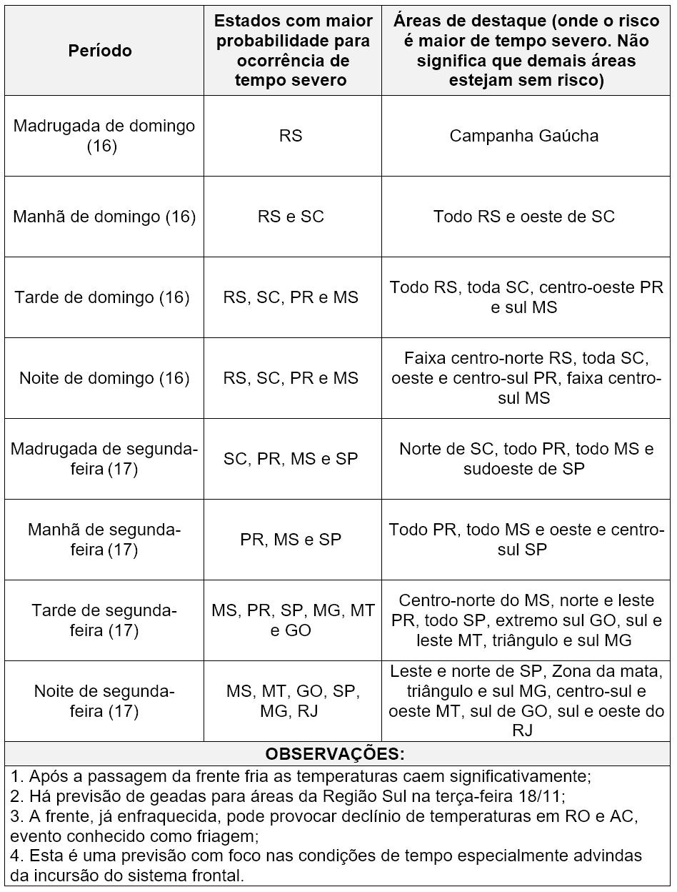 Abaixo segue a cronologia inicialmente prevista para as áreas com maior risco de tempo severo, associados à incursão do sistema frontal, que se inicia em 16 de novembro de 2025.