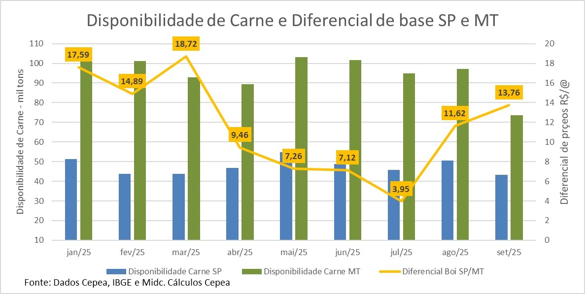 Esse movimento de MS destoa do observado em Mato Grosso (MT). No estado, que concentra o maior volume confinado do Brasil , o diferencial a favor de São Paulo (ou seja, SP mais caro) aumentou expressivamente. O diferencial saiu de apenas R$ 3,95/arroba em julho (a menor da história) para R$ 19,07/arroba na parcial de outubro.