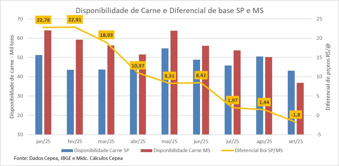 Historicamente, os preços em São Paulo são a referência, mas em setembro e também neste mês de outubro, as médias em MS superam as de São Paulo. Na parcial deste mês (até dia 20), a média em MS estava 37 centavos/arroba acima da de SP , sendo que em setembro, o MS já esteve à frente em R$ 1,80/arroba.
